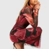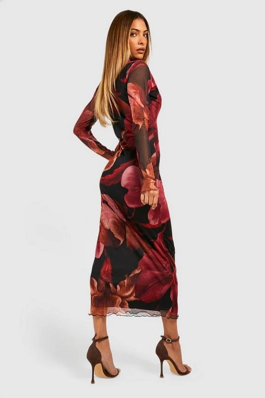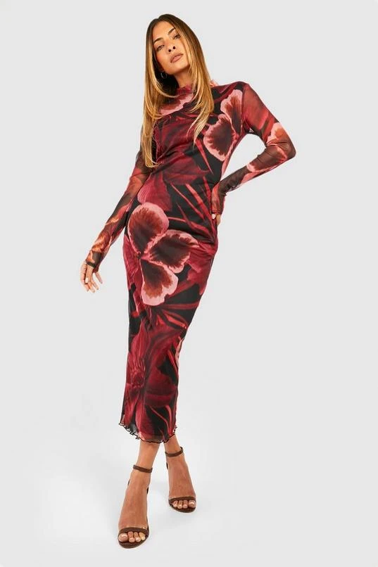 BOOHOO Abstract Floral Mesh High Neck Midi Dress