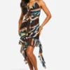BOOHOO Abstract Halter Chiffon Ruffle Mini Dress