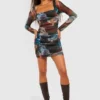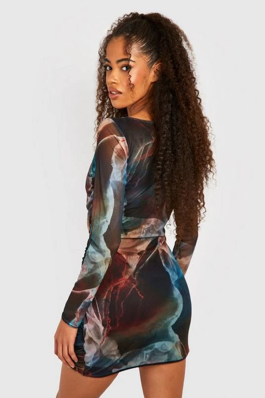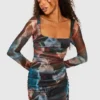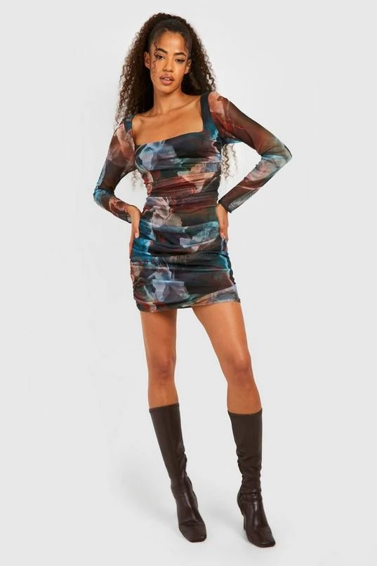 BOOHOO Abstract Square Neck Ruched Mesh Bodycon Dress