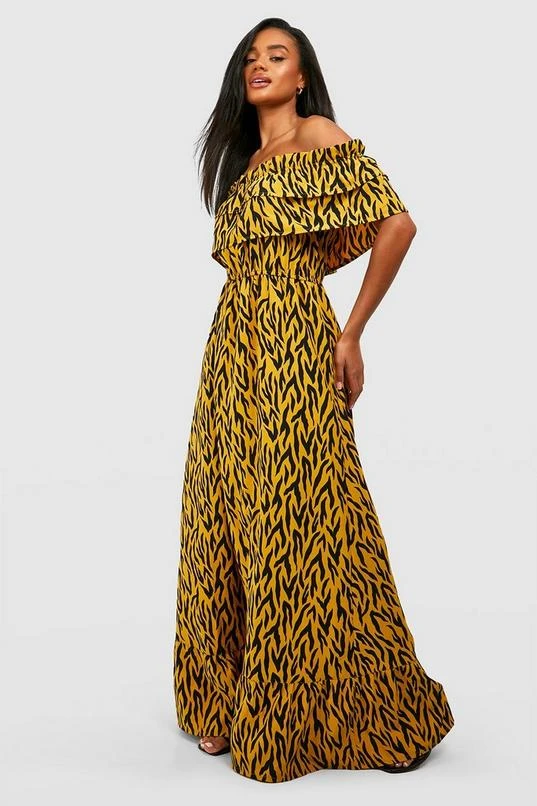 BOOHOO Animal Print Off The Shoulder Ruffle Maxi Dress