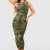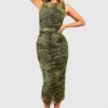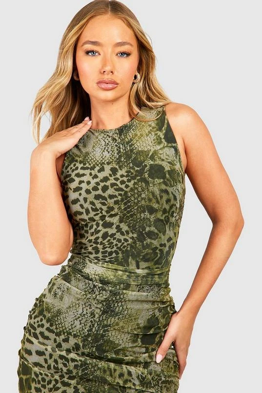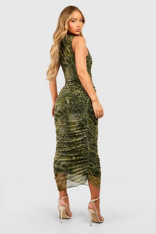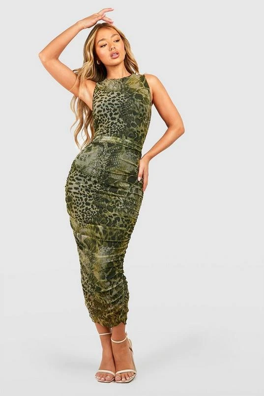 BOOHOO Animal Print Ruched Mesh Midi Dress