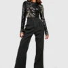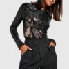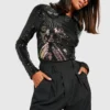 BOOHOO Black Demask Sequin Backless Bodysuit