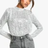 An all-in-one garment featuring sequined detailing, add a touch of luxe to your wardrobe with the ultra-glam sequin bodysuit. It’s a bold, statement piece that’s perfect as a going out bodysuit. Dazzle all night long in a black long sleeve design; style it with black cigarette trousers and strappy heels for a red-carpet worthy look. From hot dates to nights with the girls, give your ‘jeans and a nice top’ collection the level-up it deserves with a sparkly bodysuit.