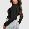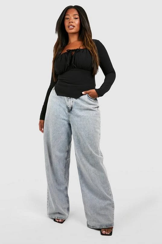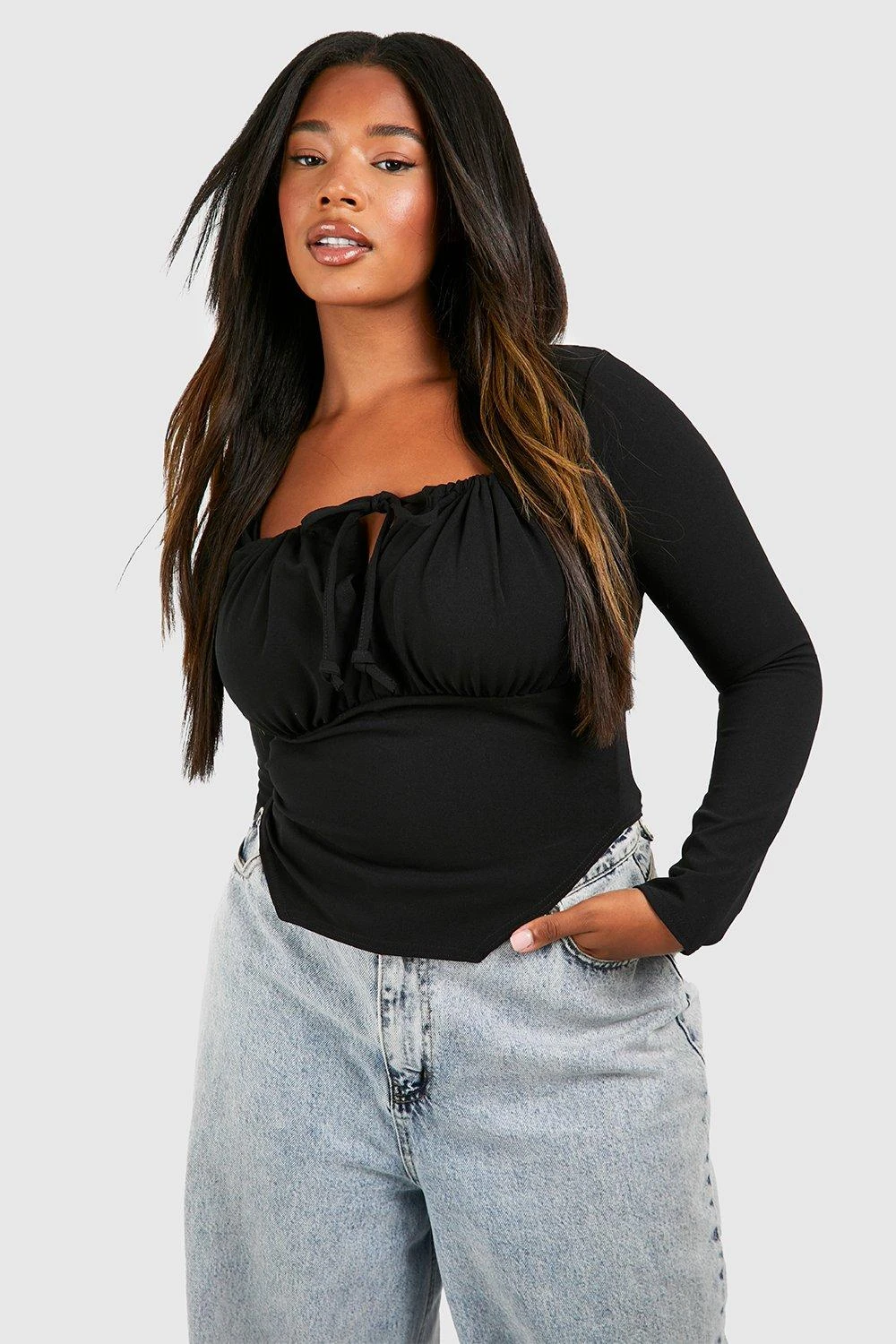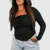 BOOHOO Black Plus Tie Front Long Sleeve Corset Top