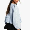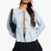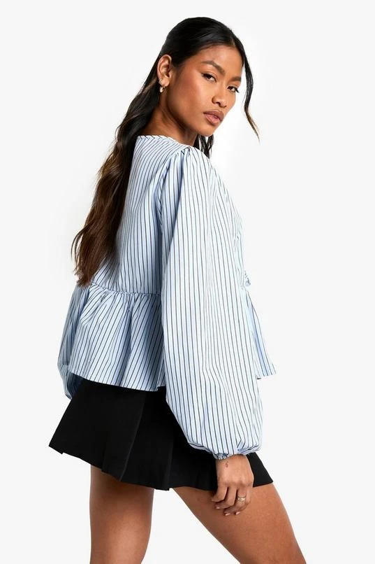 BOOHOO Blue Stripe Tie Front Puff Long Sleeve Smock Top
