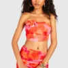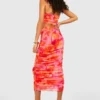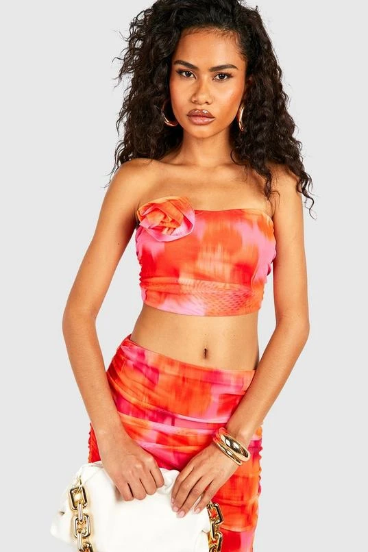 BOOHOO Blurred Floral Ruched Mesh Corsage Top & Midi Skirt