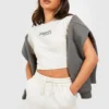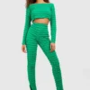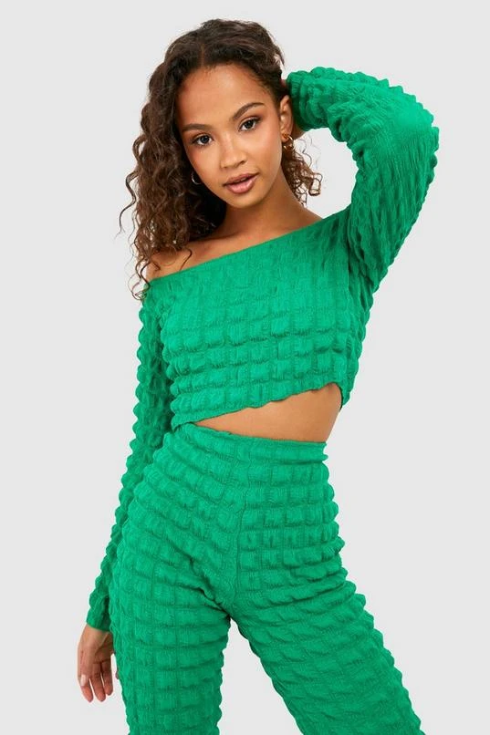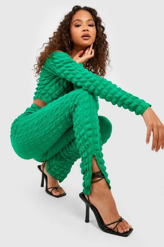 BOOHOO Bubble Jersey Knit Off The Shoulder Crop & Split Hem Pants