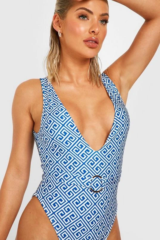 BOOHOO Contrast Geo Plunge Belted Swimsuit