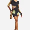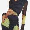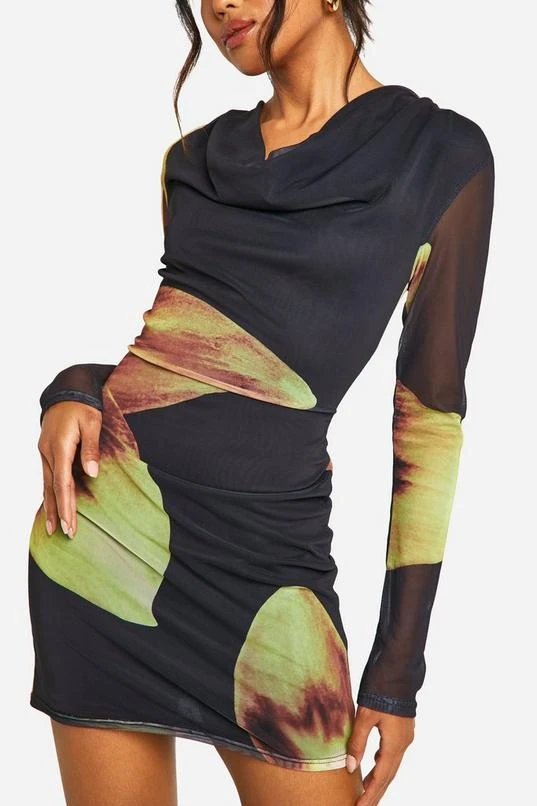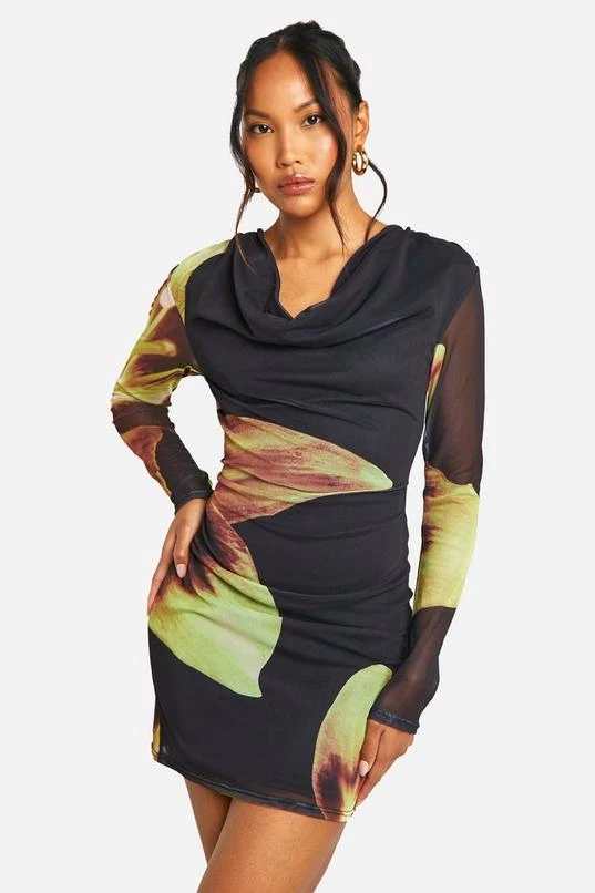 BOOHOO Cowl Neck Floral Mesh Long Sleeve Mini Dress