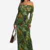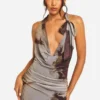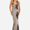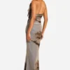 BOOHOO Cowl Neck Printed Mesh Tie Neck Maxi Dress