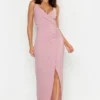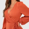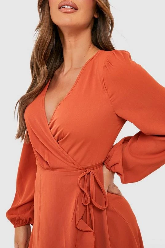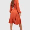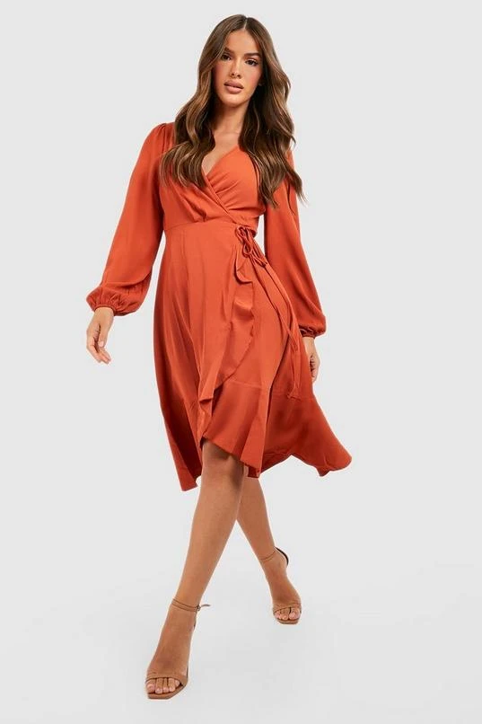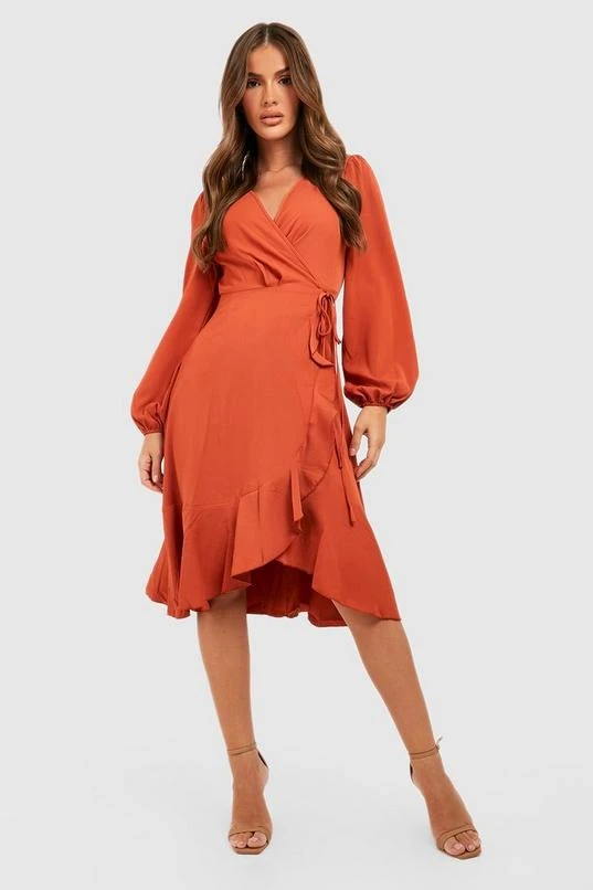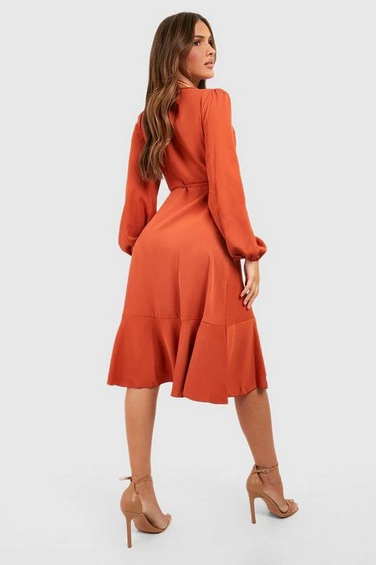 BOOHOO Crepe Ruffle Wrap Midi Skater Dress