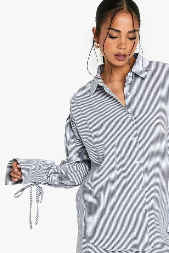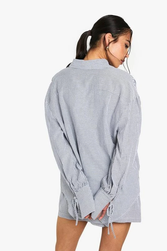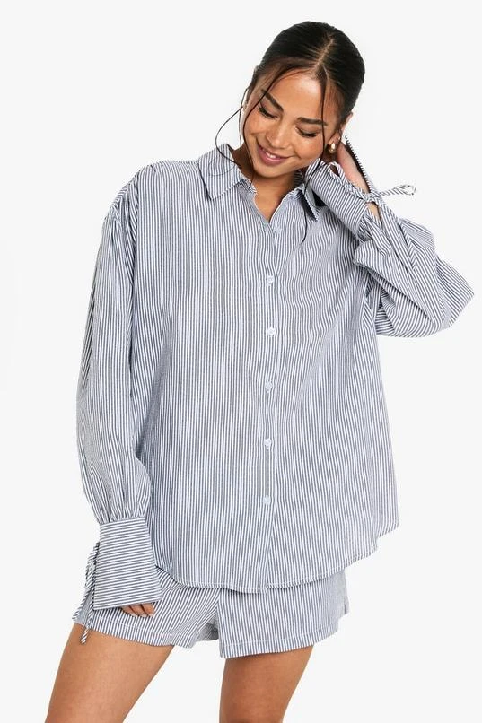 BOOHOO Crinkle Stripe Tie Cuff Shirt And Short Co-ord