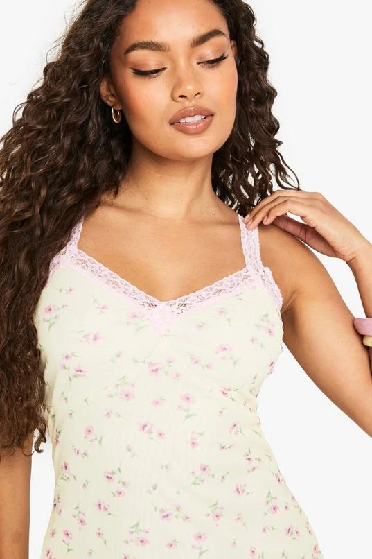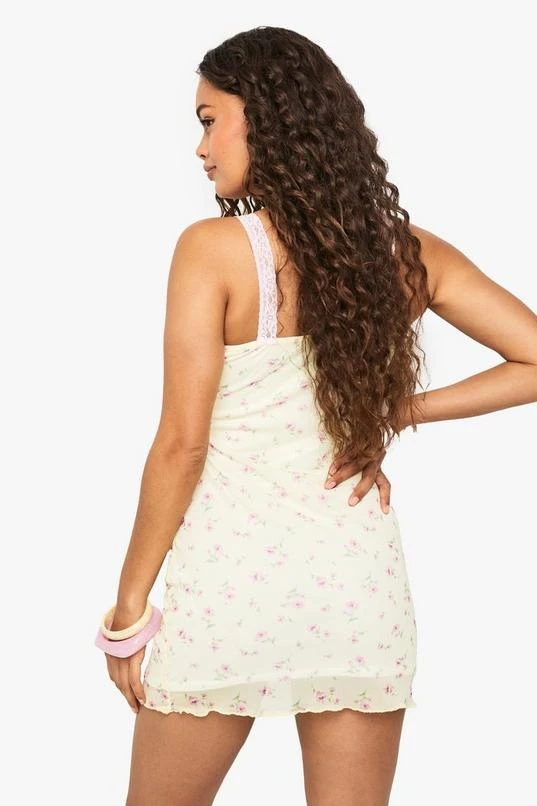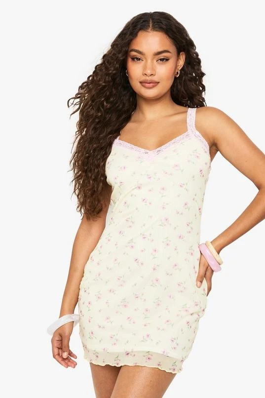 BOOHOO Ditsy Floral Contrast Lace Trim Mesh Slip Dress
