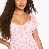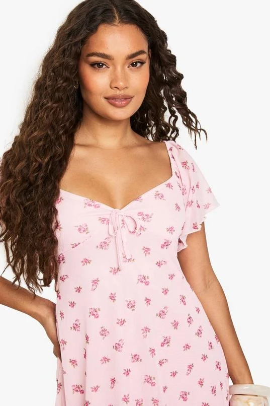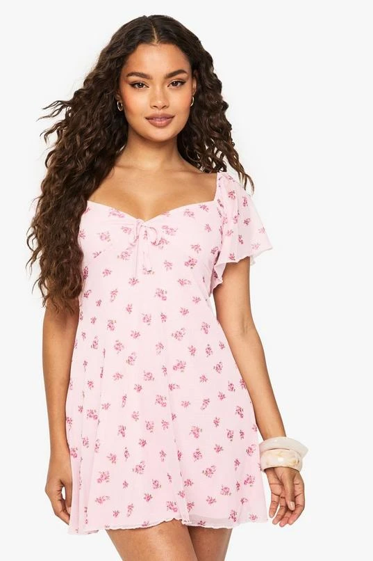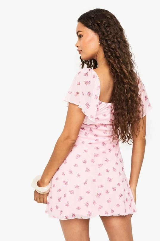 BOOHOO Ditsy Floral Mesh Angel Sleeve Tie Front Mini Dress