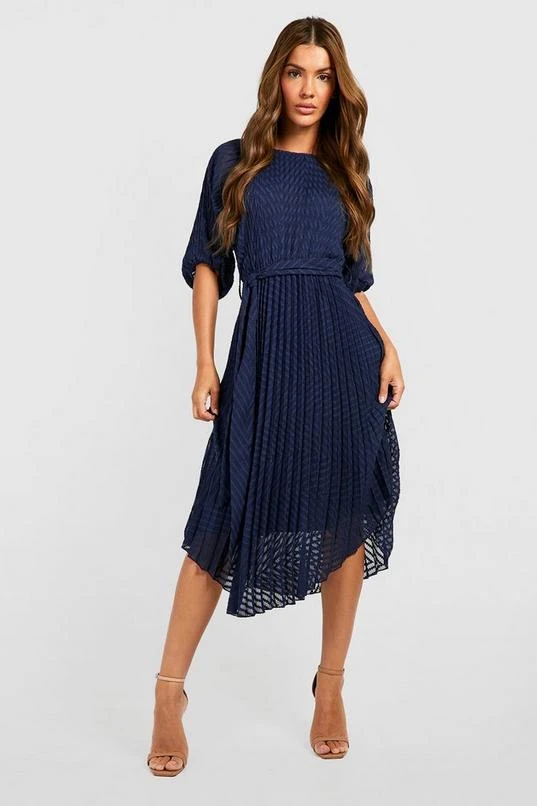 BOOHOO Dobby Pleated Puff Sleeve Midi Dress