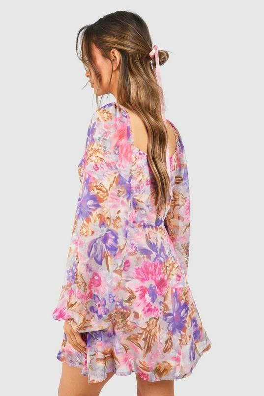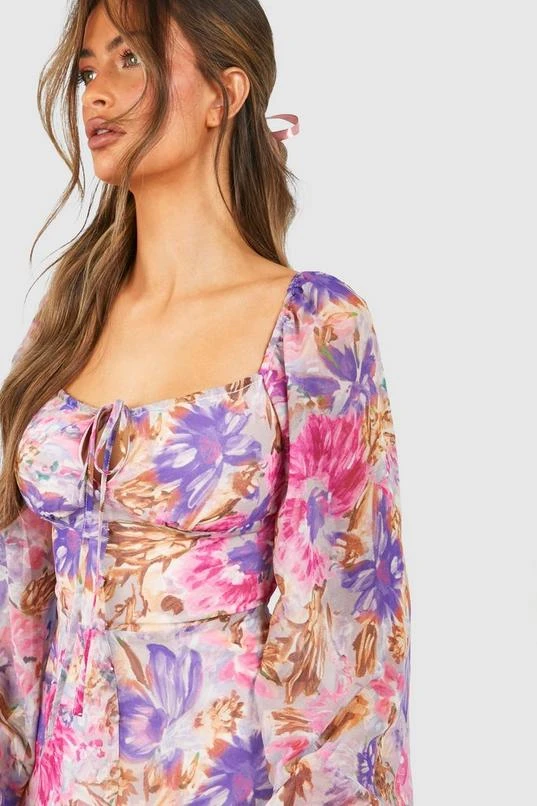 BOOHOO Floral Chiffon Balloon Sleeve Milkmaid Mini Dress
