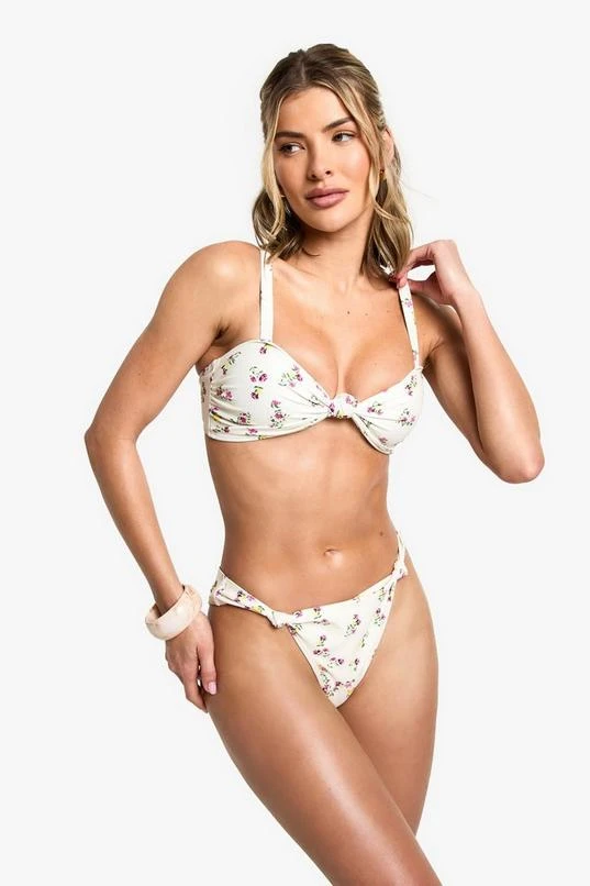 BOOHOO Floral Print Knot Front Bikini Top & Tanga Bikini Bottoms Set