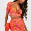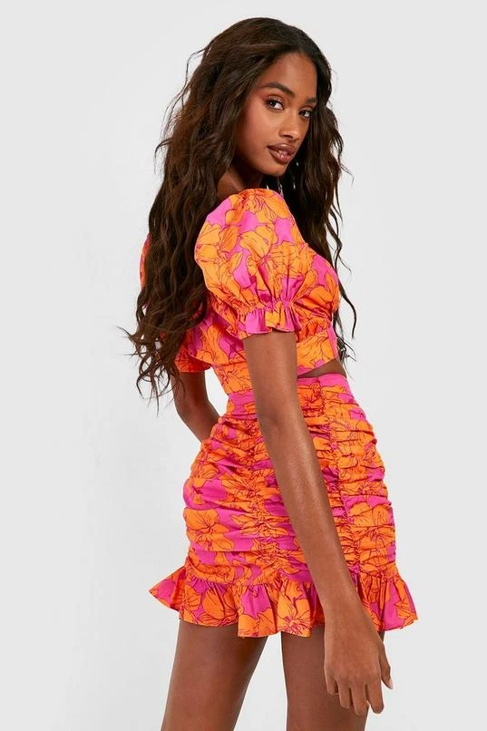 BOOHOO Floral Puff Sleeve Crop & Ruched Mini Skirt