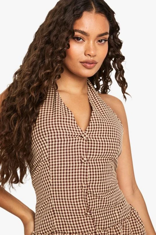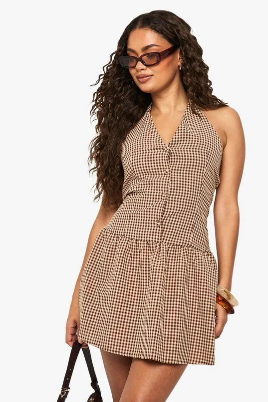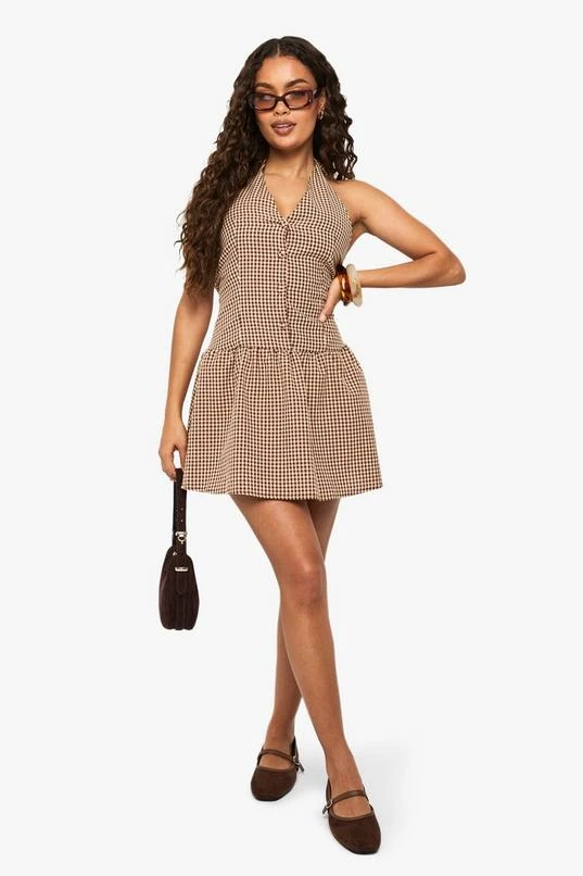 BOOHOO Gingham Halterneck Puffball Mini Dress