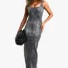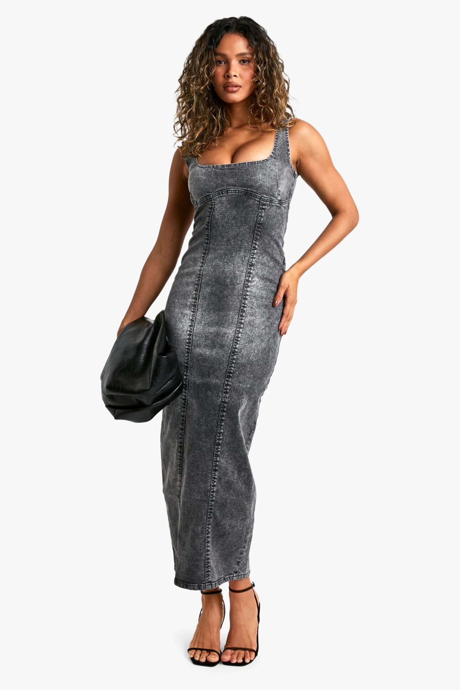 BOOHOO Grey Wash Stretch Denim Seam Detail Maxi Dress