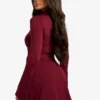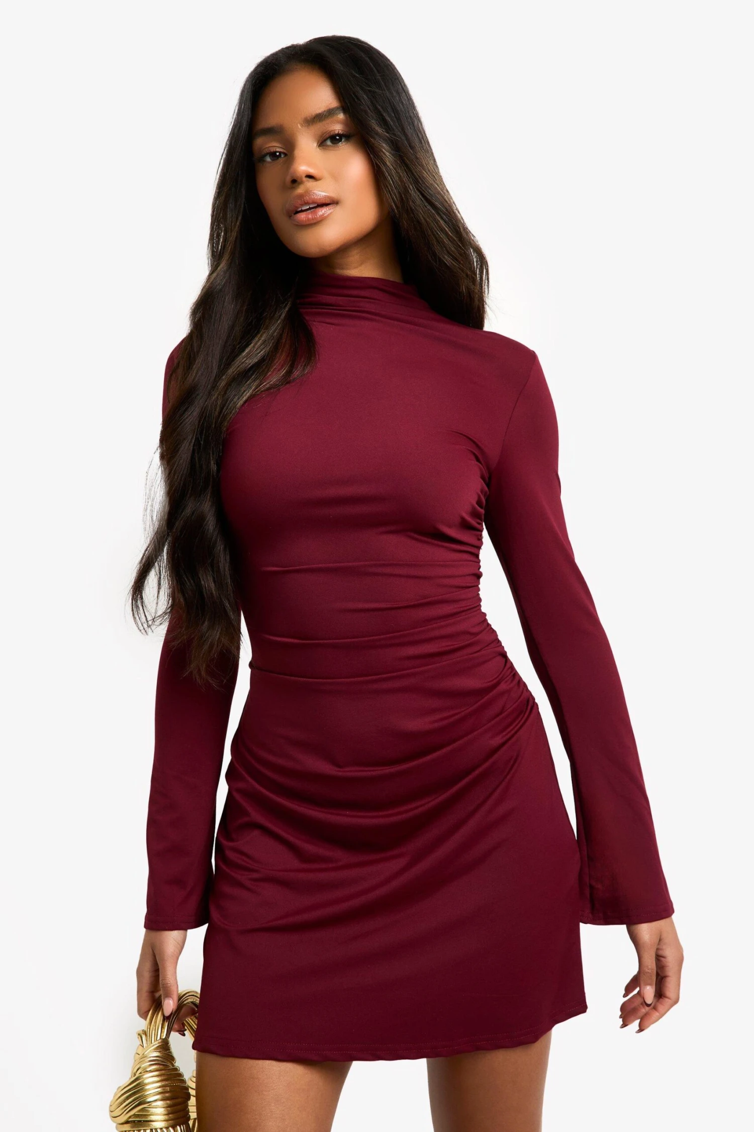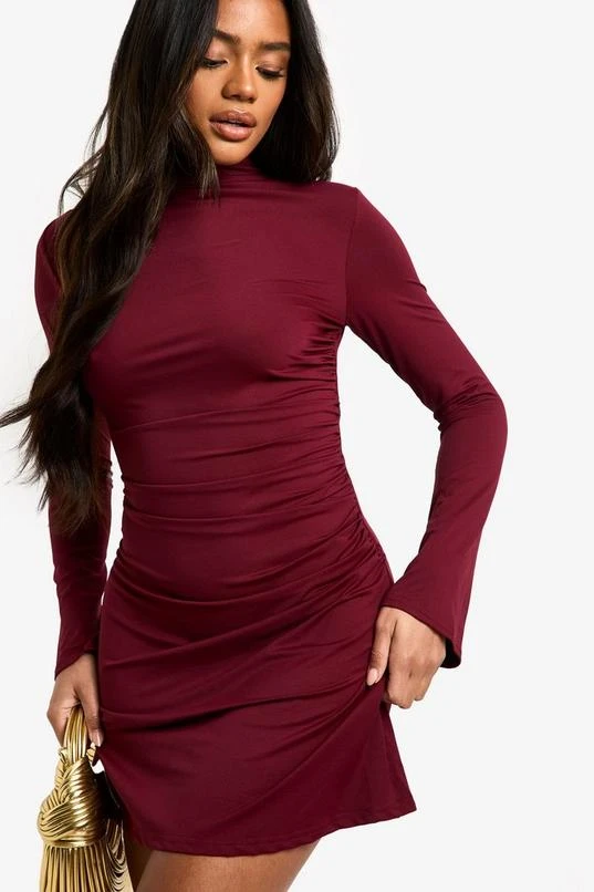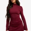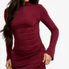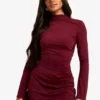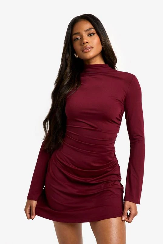 BOOHOO High Neck Long Sleeve Ruched Waist Shift Dress