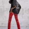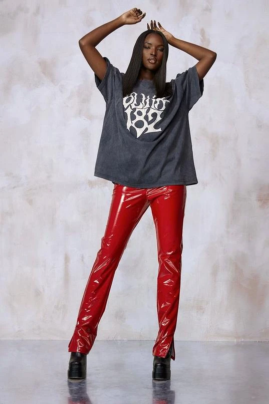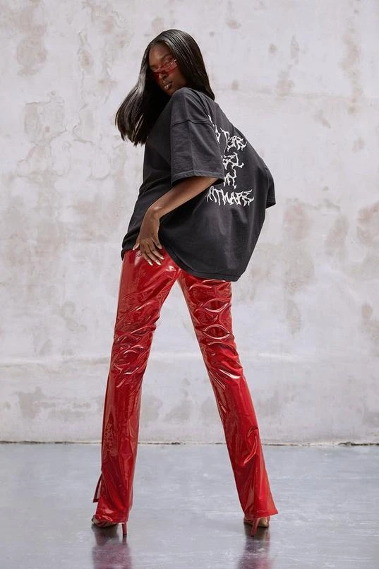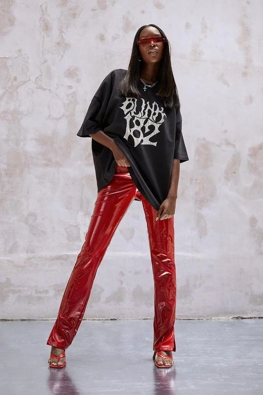 Complete with a high-shine finish and back pocket detailing, make a style statement with these high shine pants. Made from standard polyurethane on a recycled polyester backing, this piece has been designed for durability; wear 30+ times to help reduce the impact of fashion. Need style inspo? Team with an oversized band tee and heels for cocktails with the girls or wear with a classic white tank top and an oversized bomber jacket for off-duty plans. Discover the exclusive collection designed with Kourtney Kardashian Barker. A collaboration to discover more about sustainability and style.
