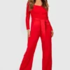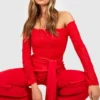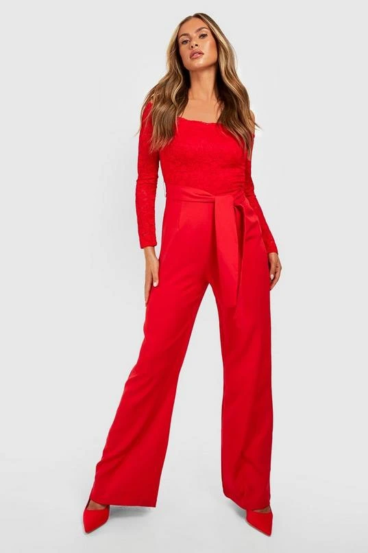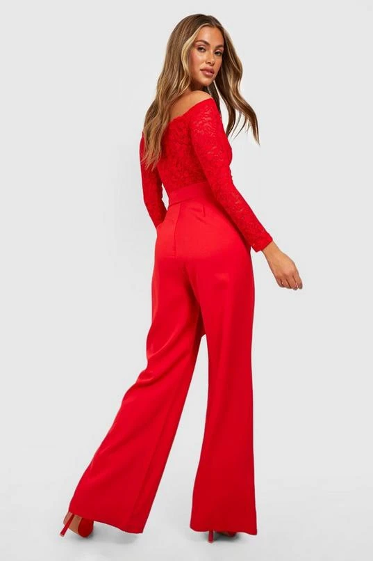 BOOHOO Lace Off The Shoulder Bow Detail Wide Leg Jumpsuit