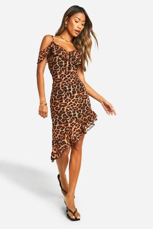 BOOHOO Leopard Chiffon Assymteric Ruffle Strappy Mini Dress