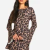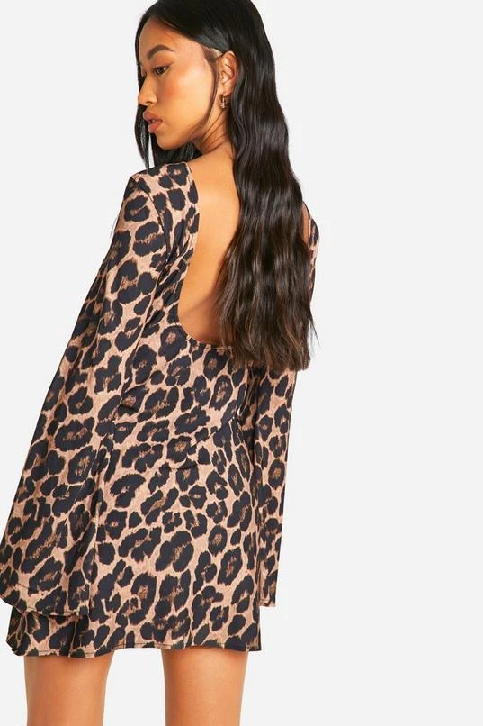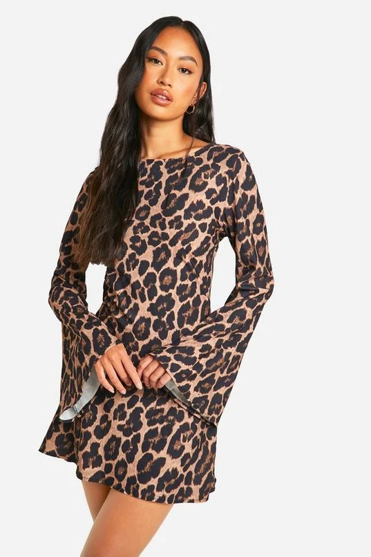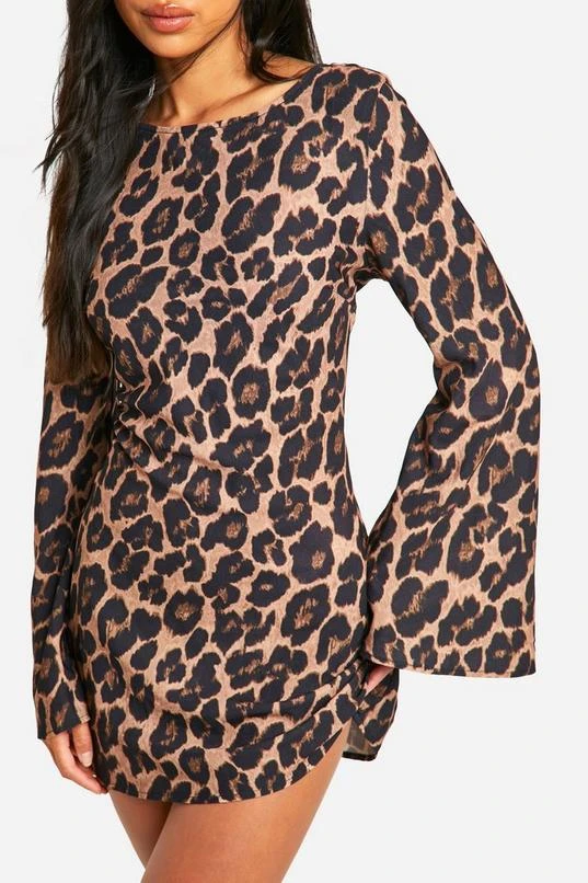 BOOHOO Leopard Low Back Flare Sleeve Dress