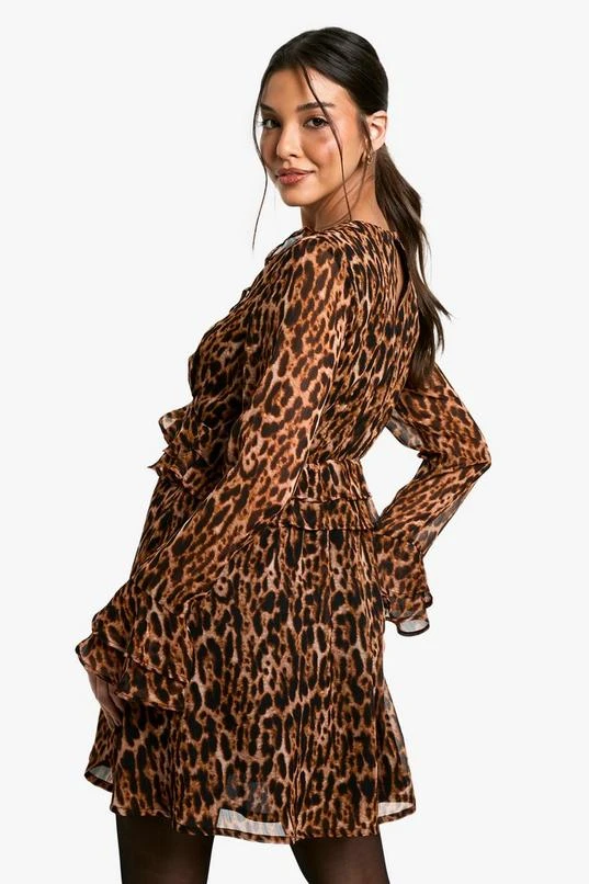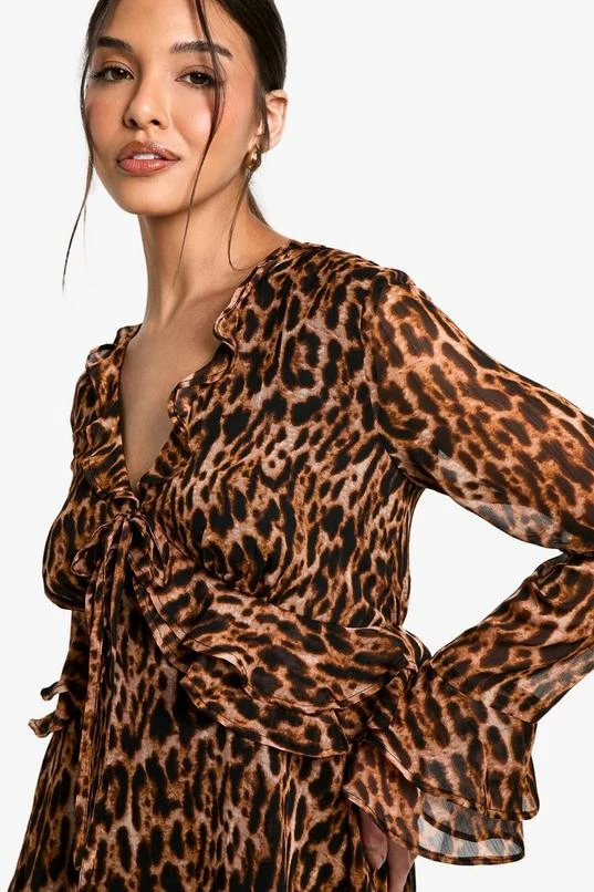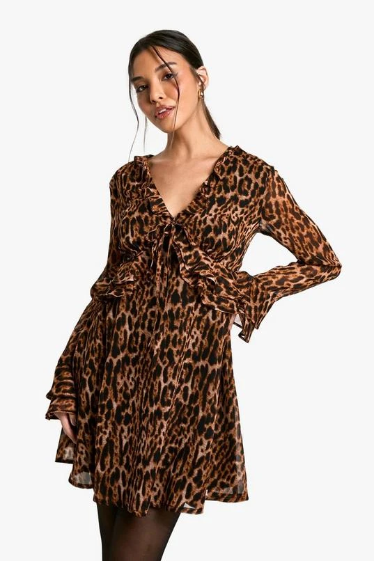 BOOHOO Leopard Ruffle Sleeve Mini Dress