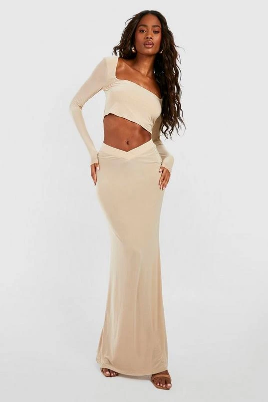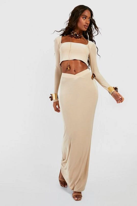 BOOHOO Long Sleeve Cropped Top & V Waist Flared Hem Maxi Skirt