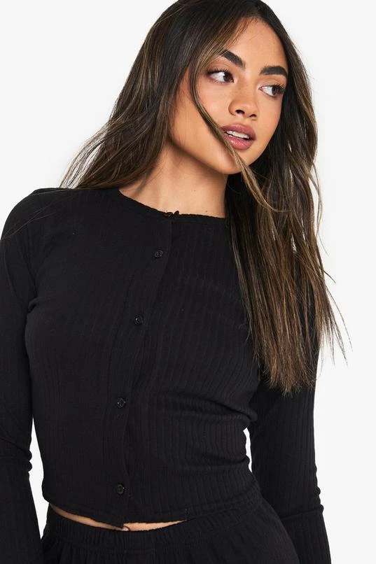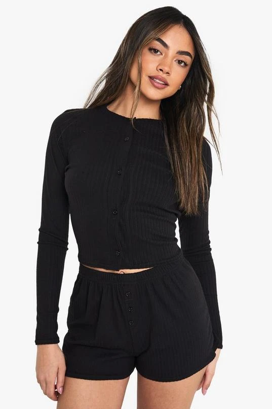 BOOHOO Loungewear Soft Rib Long Sleeve Button Through Top & Trousers Set