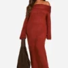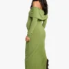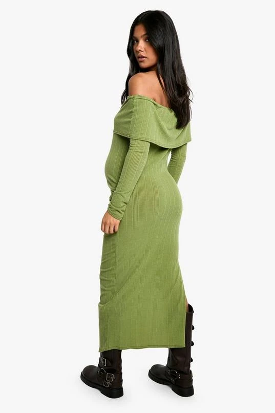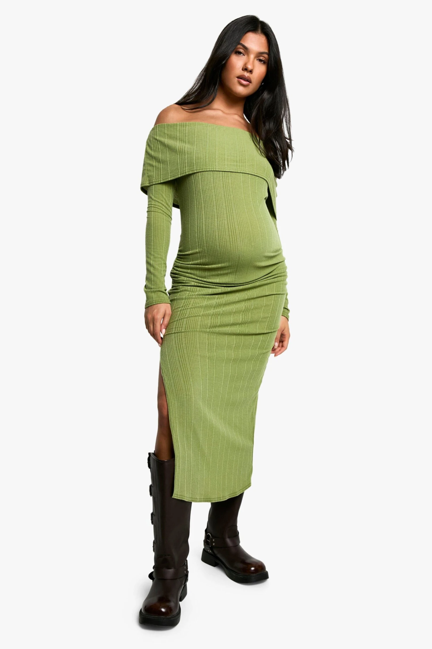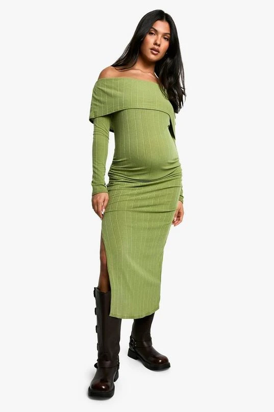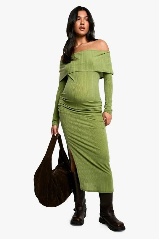 BOOHOO Maternity Wide Soft Rib Deep Bardot Long Sleeve Side Split Midaxi Dress