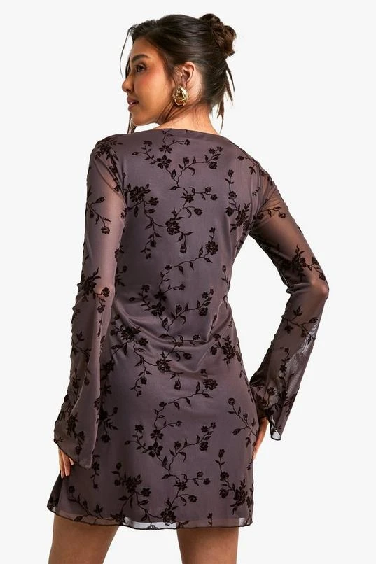 BOOHOO Mesh Tie Front Flare Sleeve Mini Dress