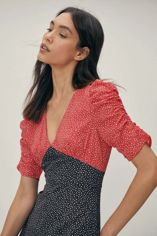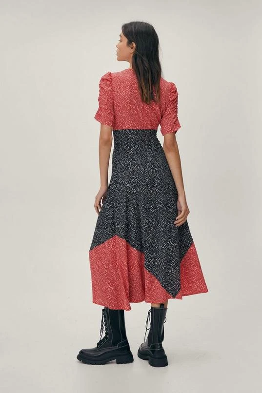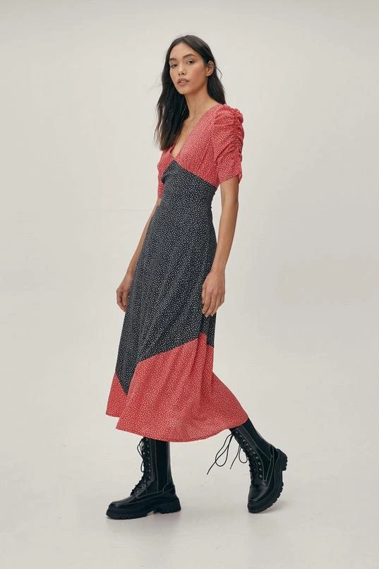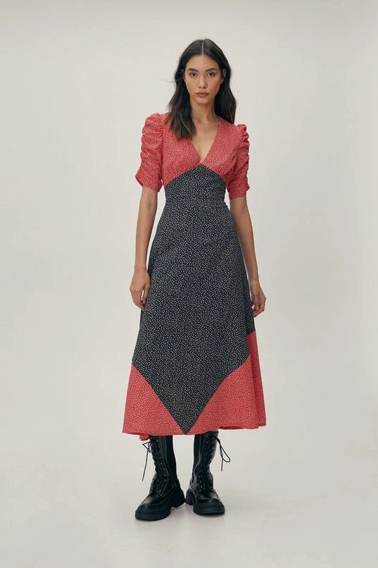BOOHOO Mixed Print V Neck Midi Dress