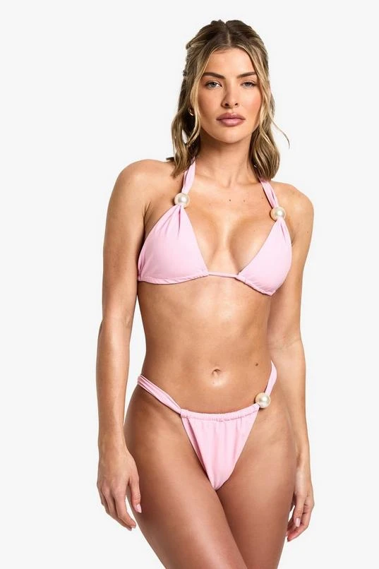 BOOHOO Pearl Trim Triangle Bikini Top & Tanga Bikini Bottoms Set
