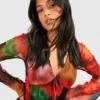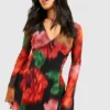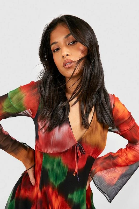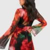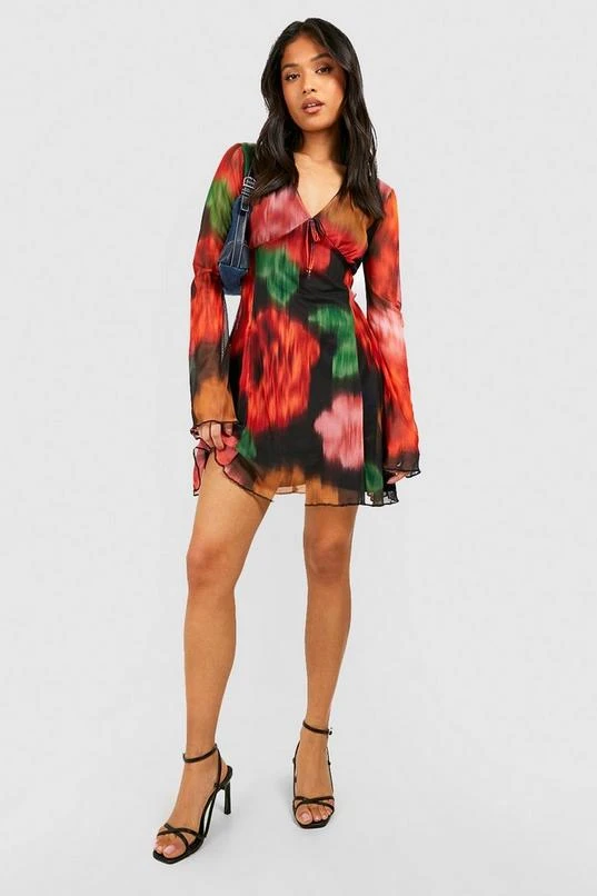 BOOHOO Petite Blurred Floral Mesh Flare Sleeve Dress