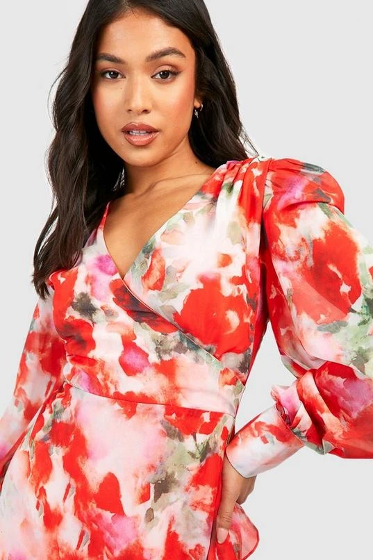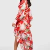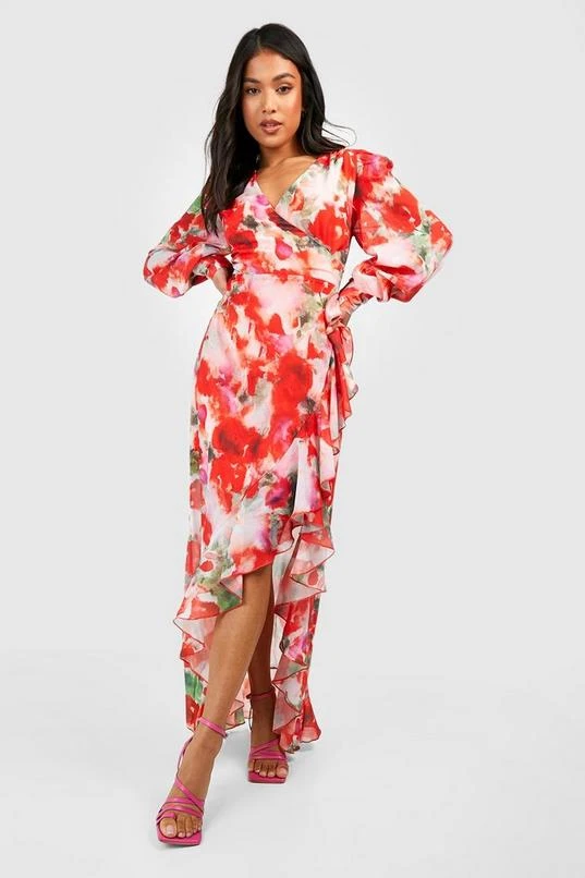 BOOHOO Petite Chiffon Floral Wrap Ruffle Maxi Dress