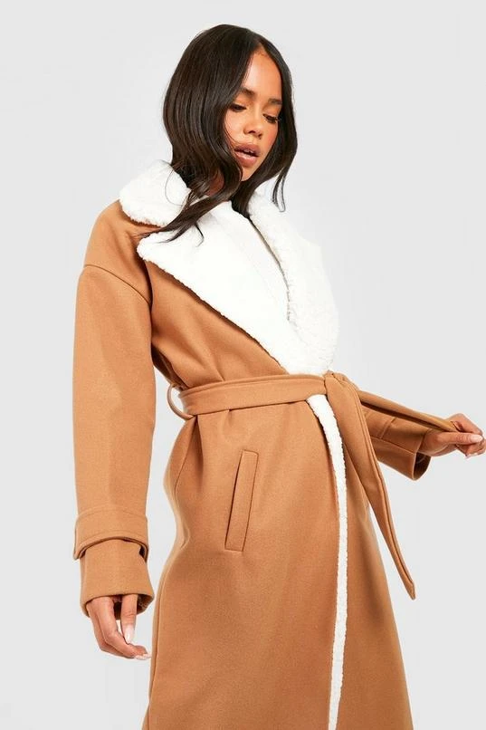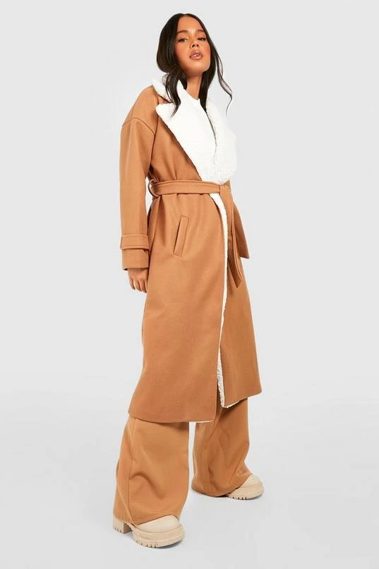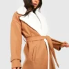 BOOHOO Petite Contrast Teddy Collar Wool Coat
