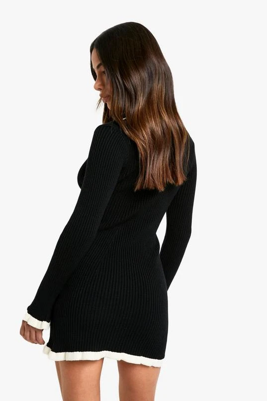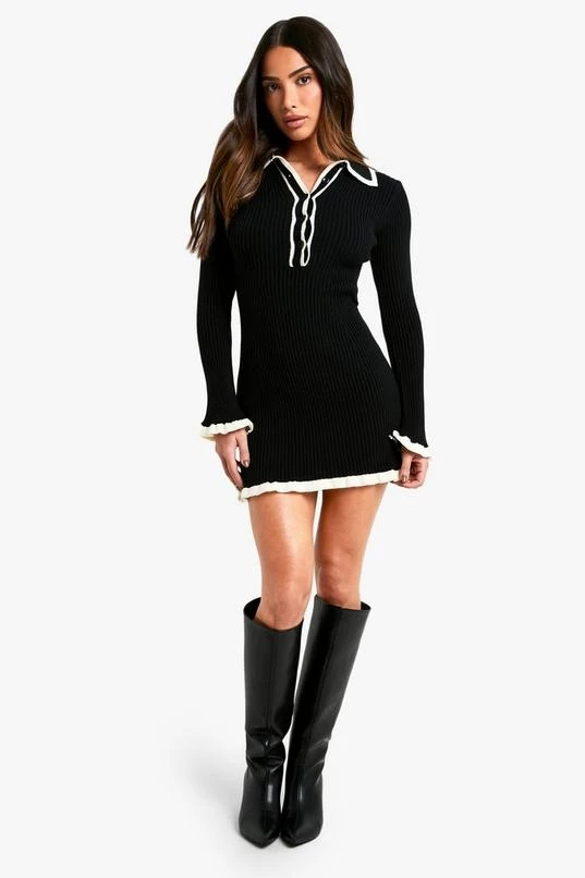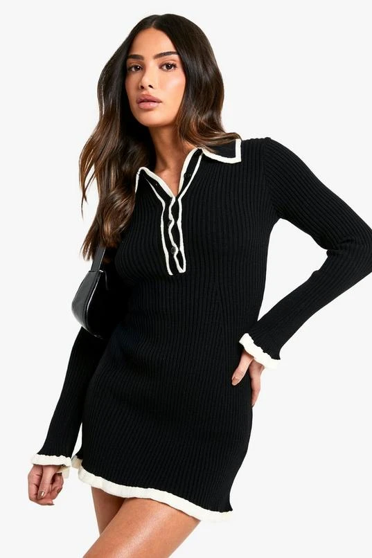 BOOHOO Petite Contrast Trim Collared Knitted Skater Dress