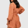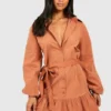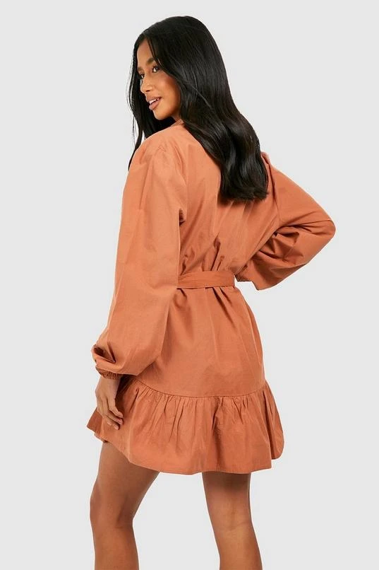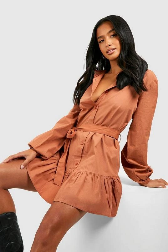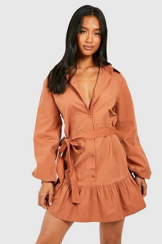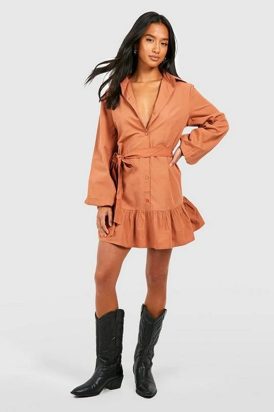 BOOHOO Petite Cotton Ruffle Hem Belted Shirt Dress