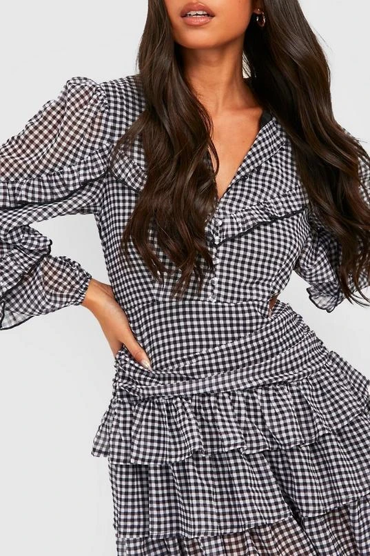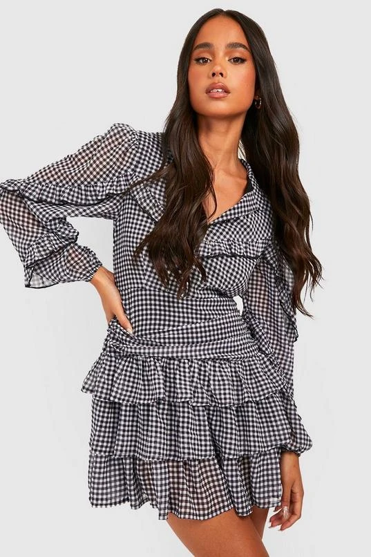 BOOHOO Petite Flannel Ruffle Detail Long Sleeve Skater Dress
