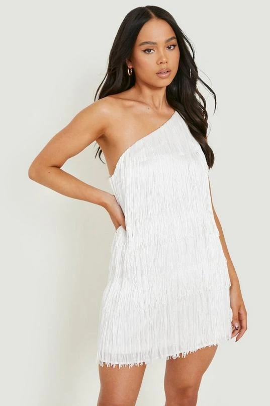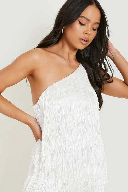 BOOHOO Petite Fringe Tassel One Shoulder Mini Dress