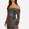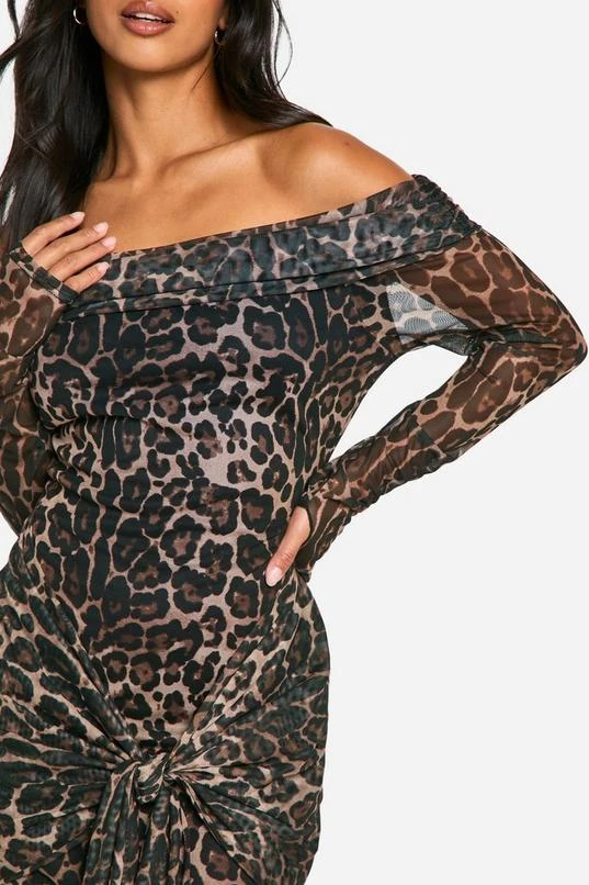 BOOHOO Petite Leopard Mesh Bardot Twist Front Mini Dress