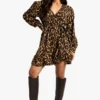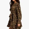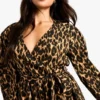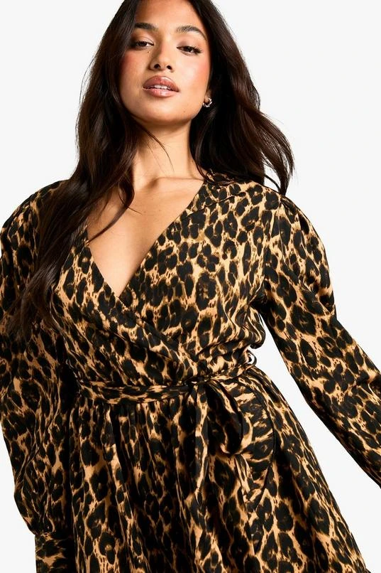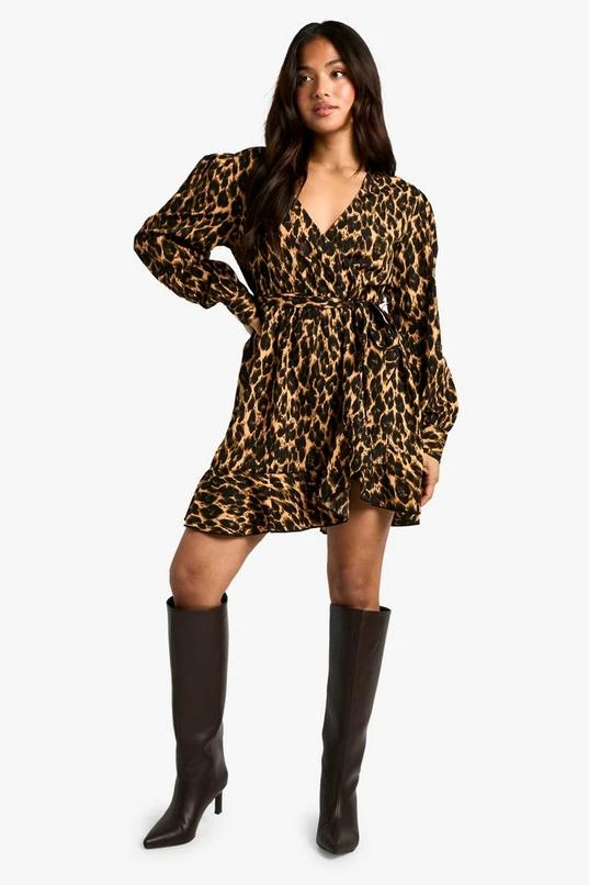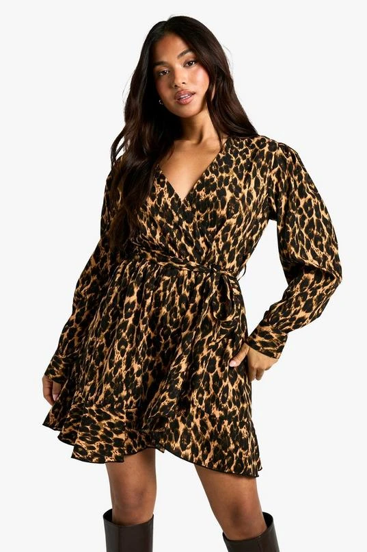 BOOHOO Petite Leopard Print Ruffle Woven Wrap Dress