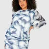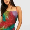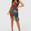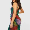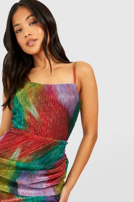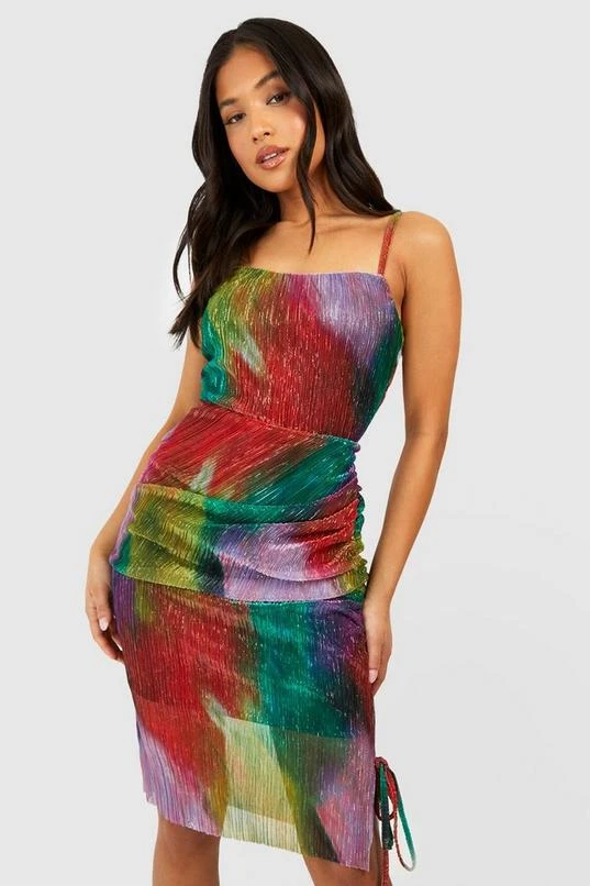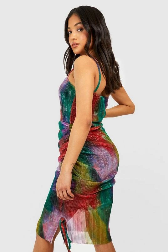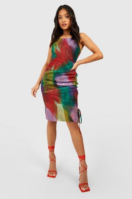 BOOHOO Petite Metallic Plisse Ruched Abstract Print Midi Dress