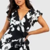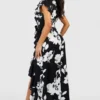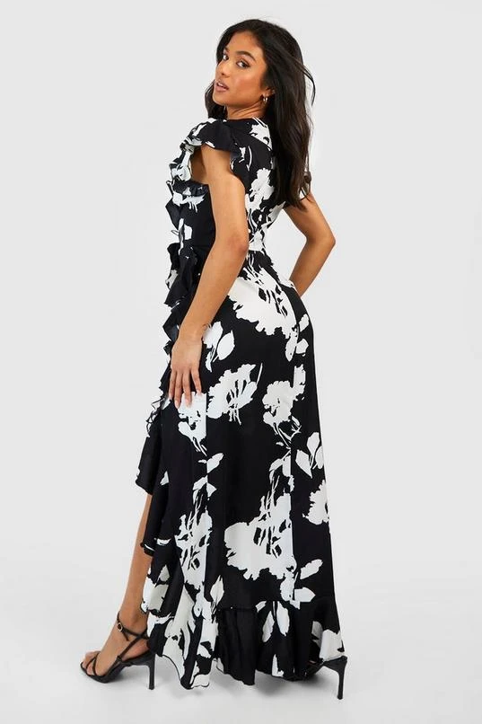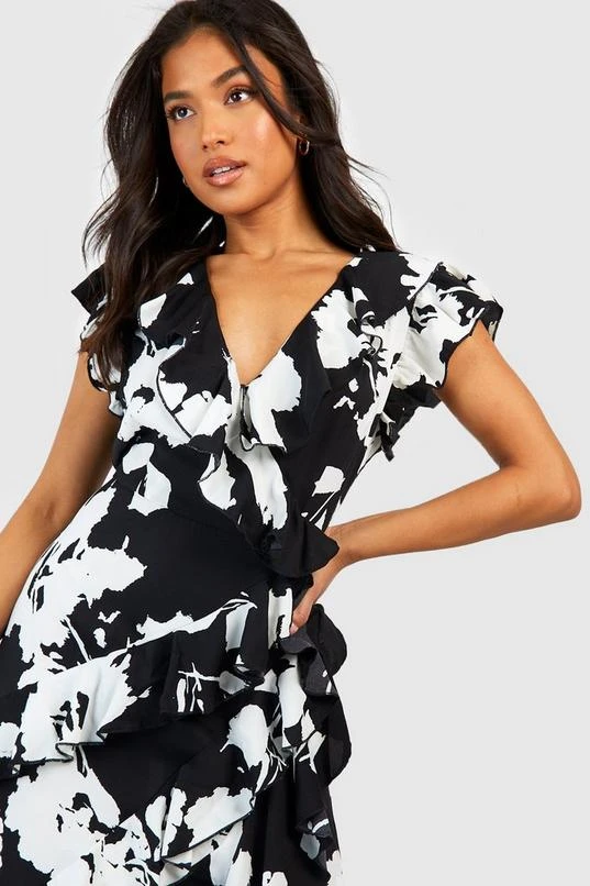 BOOHOO Petite Mono Floral Wrap Ruffle Maxi Dress