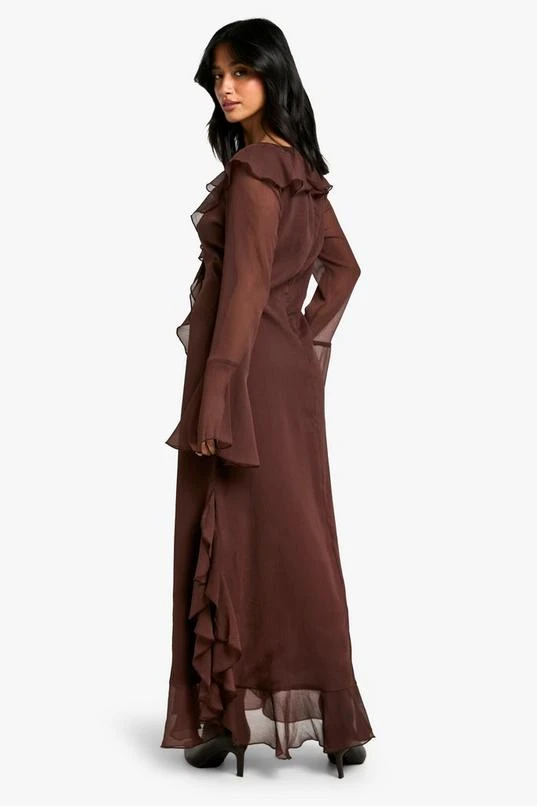 BOOHOO Petite Ruffle Flare Sleeve Belted Chiffon Maxi Dress