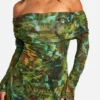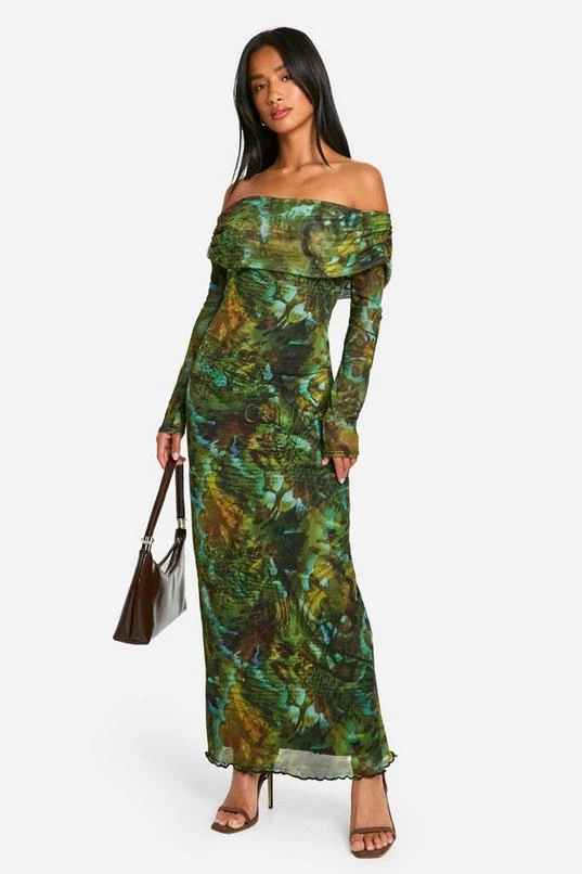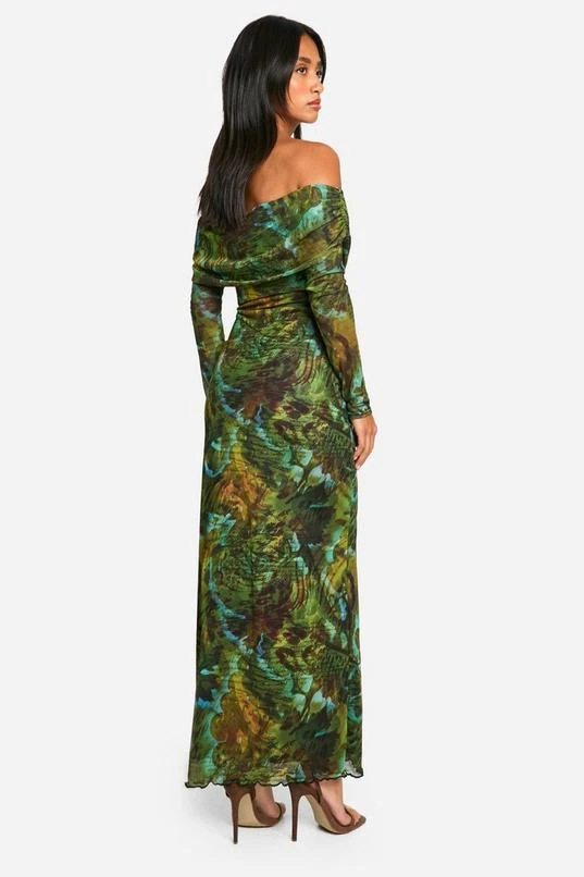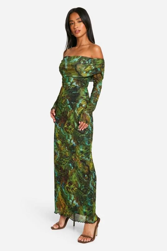BOOHOO Petite Script Print Mesh Off The Shoulder Maxi Dress