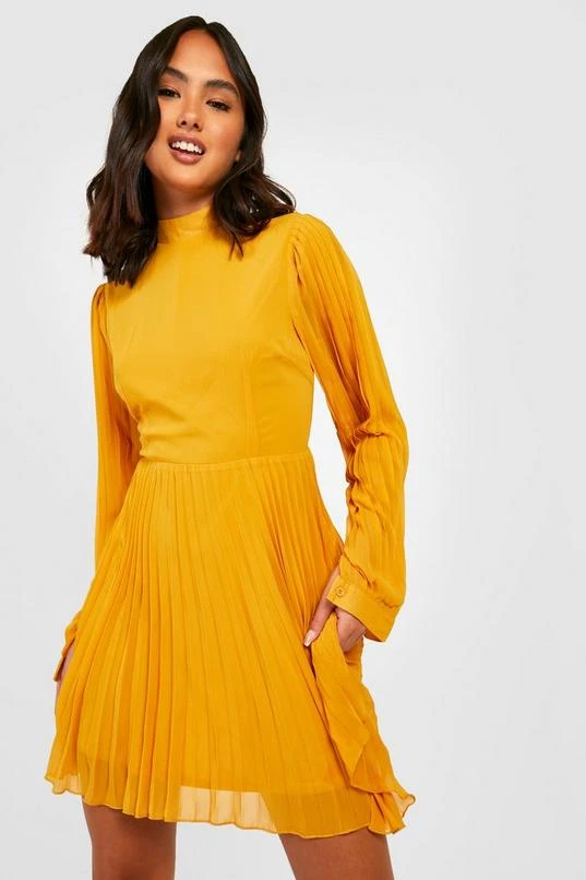 BOOHOO Pleated High Neck Blouson Sleeve Skater Dress